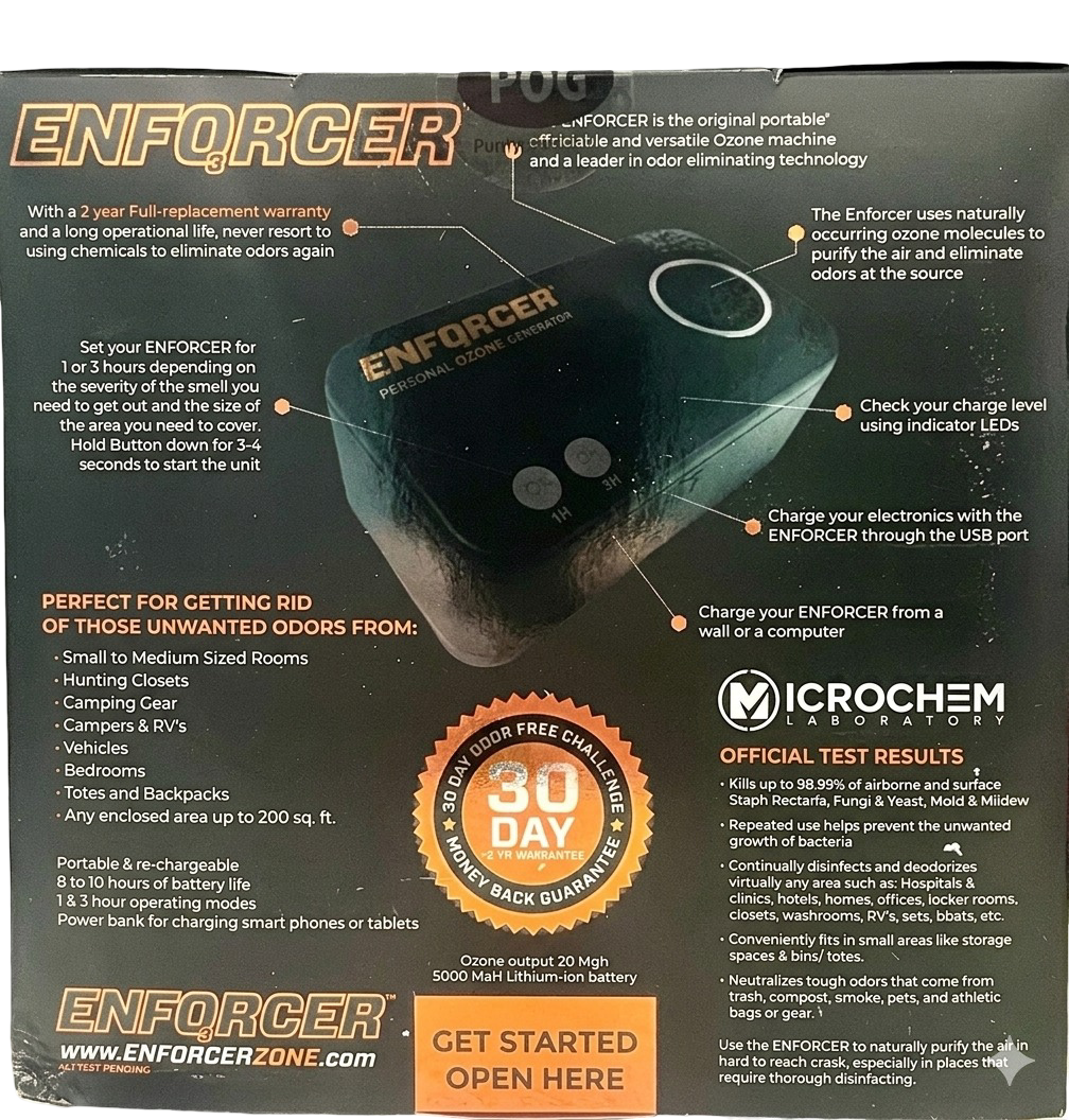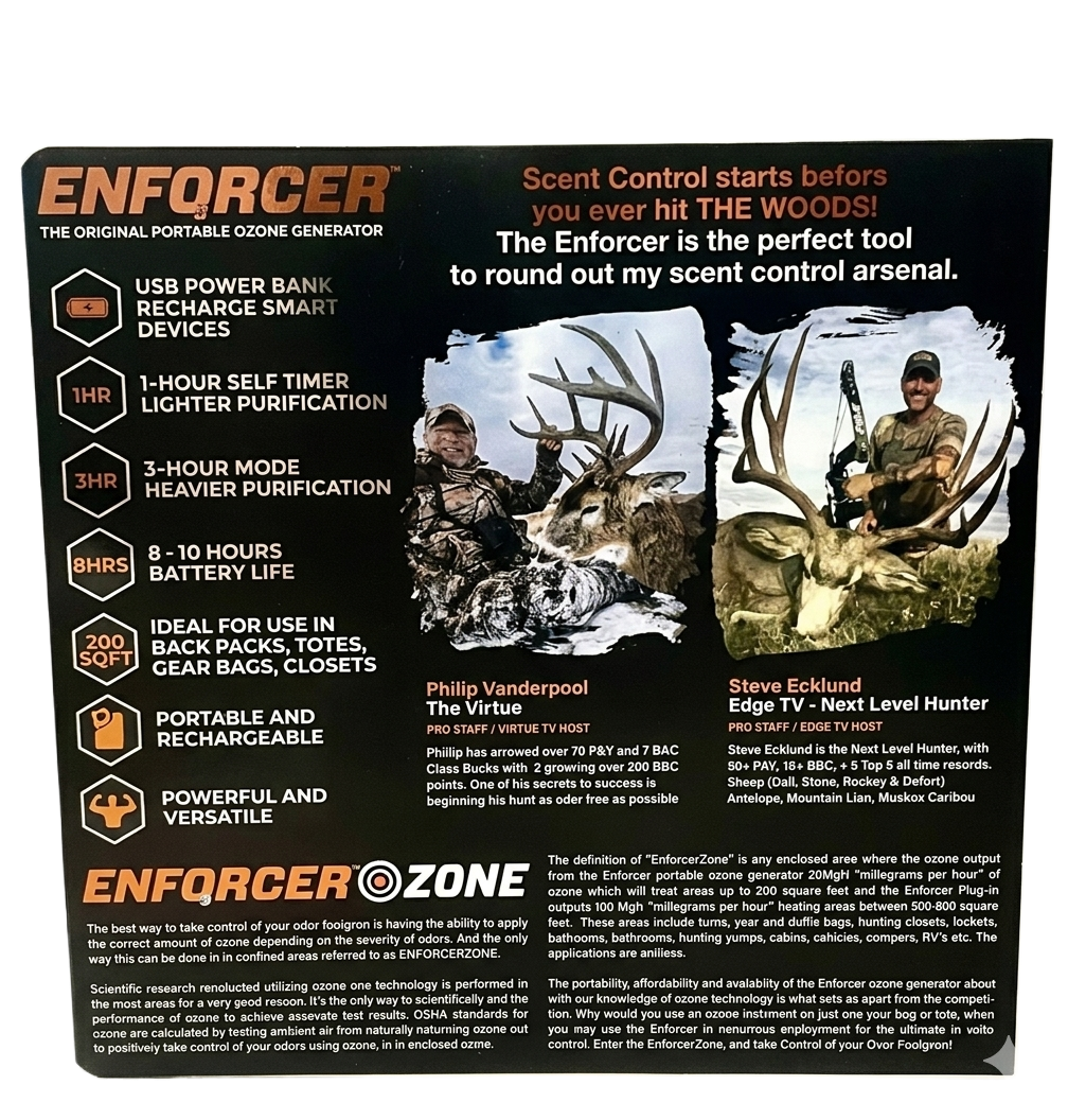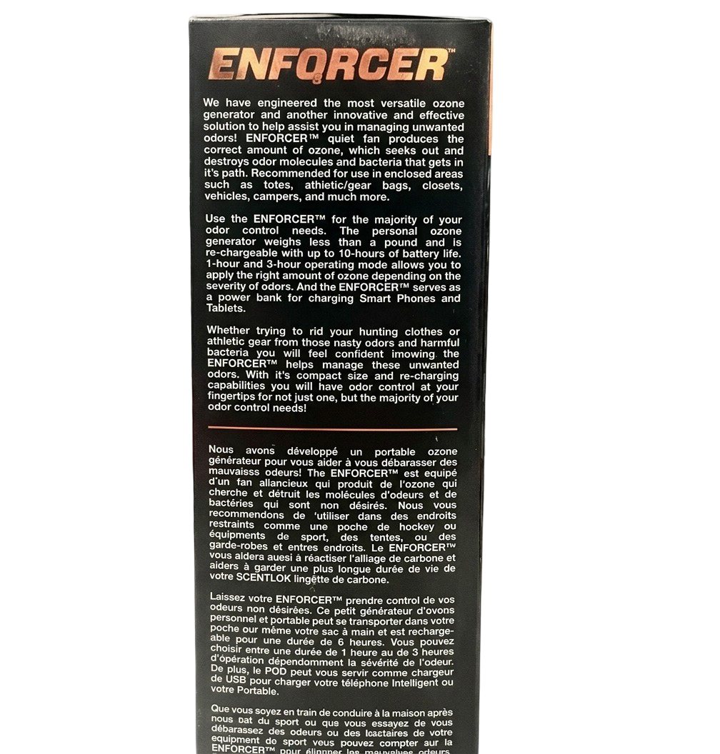 Whether trying to rid your hunting clothes or athletic gear from those nasty odours and harmful bacteria, you will feel confident knowing the ENFORCER helps manage those unwanted odours. With its compact size and recharging capacities, you will have odour control at your fingertips for not just one, but the majority of your odour control needs!