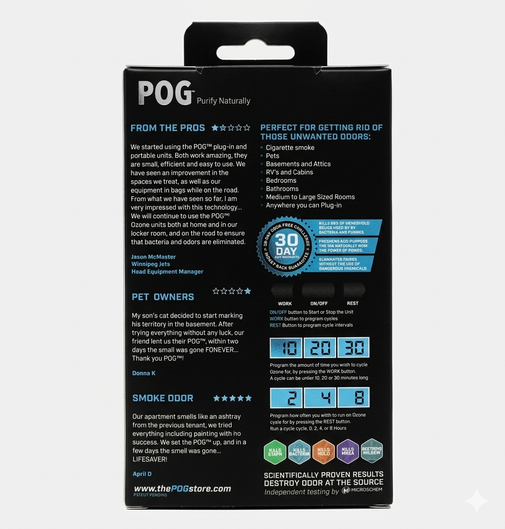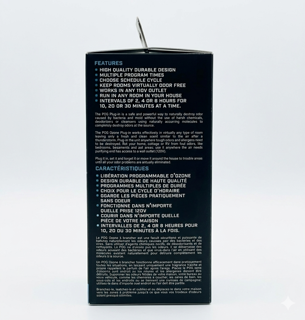 • The POG uses naturally occurring ozone molecules to purify the air and eliminate odors at the source